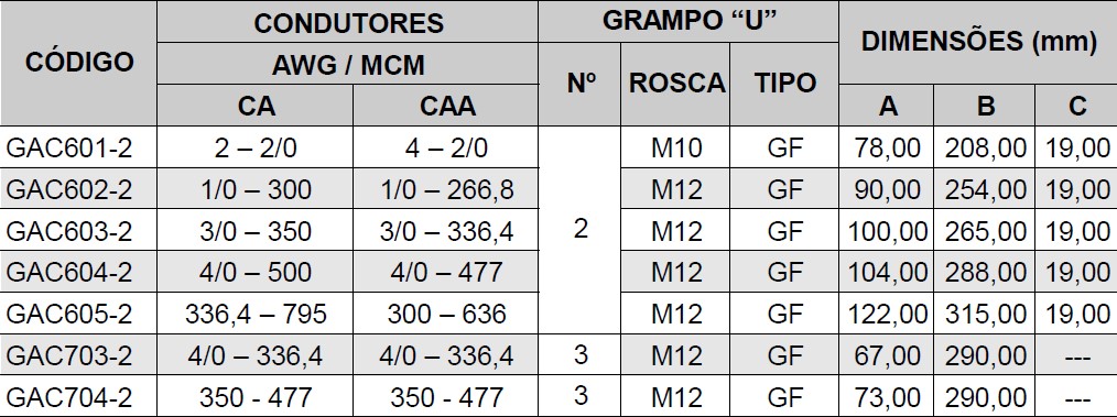 Este grampo de ancoragem é compatível com uma ampla gama de cabos de alumínio, seja com ou sem alma de aço, em séries métricas ou AWG/MCM.